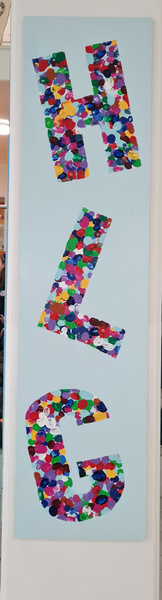 Das Kunstprojekt wurde vor zwei Jahren von einer Gruppe von Schülerinnen und Schülern initiiert und mit viel Engagement im letzten Schuljahr von Mitgliedern der AG „Schule mit Courage“ fertiggestellt. Auf den schmalen Seiten befinden sich die HLG-Buchstaben sowie Friedenstauben, jeweils bestehend aus den Fingerabdrücken der Schulgemeinschaft. Die Pusteblumen auf den breiten Seiten symbolisieren sowohl Stärke als auch Hoffnung und Aufbruch. Das Motiv wurde im letzten Schuljahr durch eine Abstimmung in der Schüler- und Lehrerschaft festgelegt.