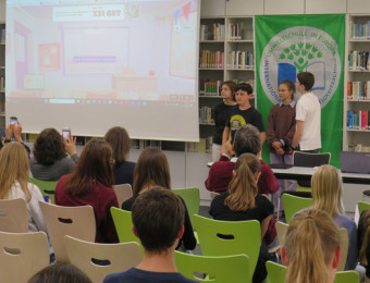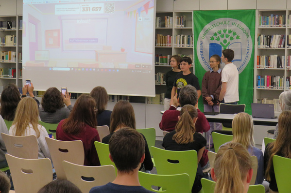 Umweltbildung beginnt in der Schule und auch Mülltrennung ist hier Teamwork. Aus diesem Grund hat die Projektgruppe um Sandra Haller zusammen mit der Schulleitung, den Hausmeistern und der Reinigungsfirma ein neues Müllkonzept für das Hans-Leinberger-Gymnasium entwickelt. Das Prinzip dabei lautet „Bewährtes bleibt und wird ergänzt“. Deshalb ist nun geplant, die Mülleimer im Schulhaus und auf dem Außengelände so zu installieren, dass nicht nur in den Klassenzimmern, sondern im gesamten Schulbereich eine sinnvolle Mülltrennung möglich ist. Derzeit läuft dazu auch die HLG Müll-Plakat-Challenge, um informative Plakate für die Mülltrennung im Schulhaus veröffentlichen zu können. Die beiden Umweltbotschafter einer Klasse sorgen jeweils dafür, dass die Regeln in den einzelnen Klassen mit Hilfe eines Informationsspieles verstanden und eingehalten werden. Eine Kostprobe aus dem Spiel führten Umweltbotschafter der Schule auch bei der Preisverleihung vor. Die Anwesenden konnten mit ihrem Handy interaktiv daran teilnehmen und ihr eigenes Wissen dabei überprüfen.