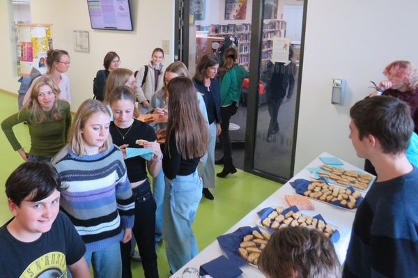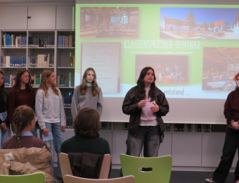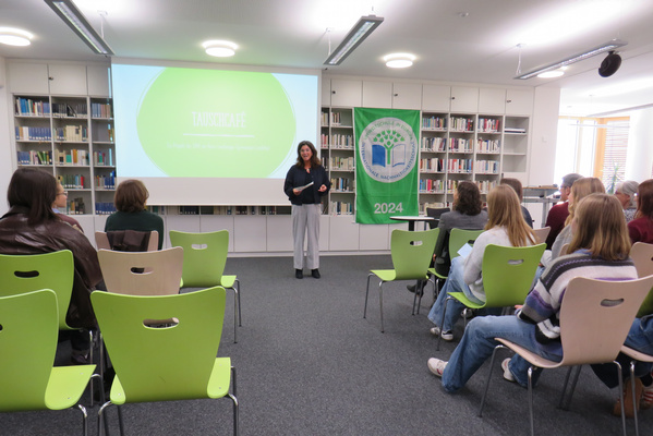 Christian Mesner stellte mit seiner Schülergruppe die noch junge Geschichte des Tauschraums dar: Nachdem die SMV auf dem Schulfest 2023 erstmals einen Kleiderbazar sehr erfolgreich durchgeführt hatte, wurde über das Konzept der Nachhaltigkeit im darauffolgenden Klassensprecherseminar weiter reflektiert und die Idee eines Tauschraums ins Leben gerufen. So können gebrauchte Bücher und Spiele mehreren Mitgliedern der Schulgemeinschaft Freude bereiten. Dank der Unterstützung der SCHOTT AG wird die Idee weiter ausgearbeitet: ein Tauschcafé soll zu Beginn jeden Monats zum Treffpunkt der Schulfamilie werden. Der Erlös wird immer an eine andere gemeinnützige Organisation gespendet werden. Die Ausbildungsleiterin des Standorts Landshut der SCHOTT AG, Frau Stephanie Hofreiter, nahm die Einladung zur Eröffnung des Tauschcafés am HLG im Dezember sehr gerne an.