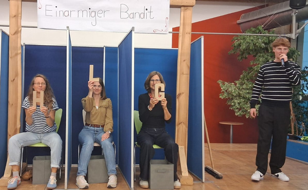 Am 17. Oktober 2025 fand unser diesjähriges Schulfest statt. Einer der Programmpunkte auf der Bühne in der Mensa war bereits zum zweiten Mal der „Einarmige Bandit“ des Elternbeirats. Moderiert von einem Schüler und einer Schülerin der Oberstufe, wurde der „Einarmige Bandit“ von Schülern aus dem Publikum gestartet. Anschließend mussten drei Lehrkräfte bei Ertönen eines Jingles gleichzeitig einen beliebigen Schulgegenstand aus ihrer Box hochhalten. War es dreimal derselbe oder kam, wie auf dem Bild zu sehen, H-L-G heraus, gab es einen kleinen Gewinn!