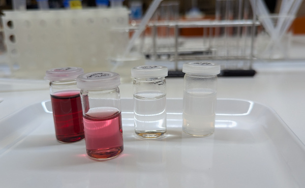 Nach einer kurzen Begrüßungs- und Kennenlernrunde machte man uns mit den Grundlagen chemischen Arbeitens vertraut. Nachdem wir alle stilecht mit weißen Kitteln und den obligatorischen Schutzbrillen versehen waren, starteten wir mit der Herstellung von Goldnanopartikeln, indem wir Goldsalz Kaliumtetrachloroaurat mit Hilfe von Tri-Natriumcitrat-Dihydrat reduzierten. Nach einer ausführlichen Größenabschätzung jener Nanopartikel mittels eines Fotometers ging es dann daran, ihre Funktionsweise als Biosensor zu bestimmen und natürlich auch die katalytischen Eigenschaften besagter Goldnanopartikel zu erfassen.